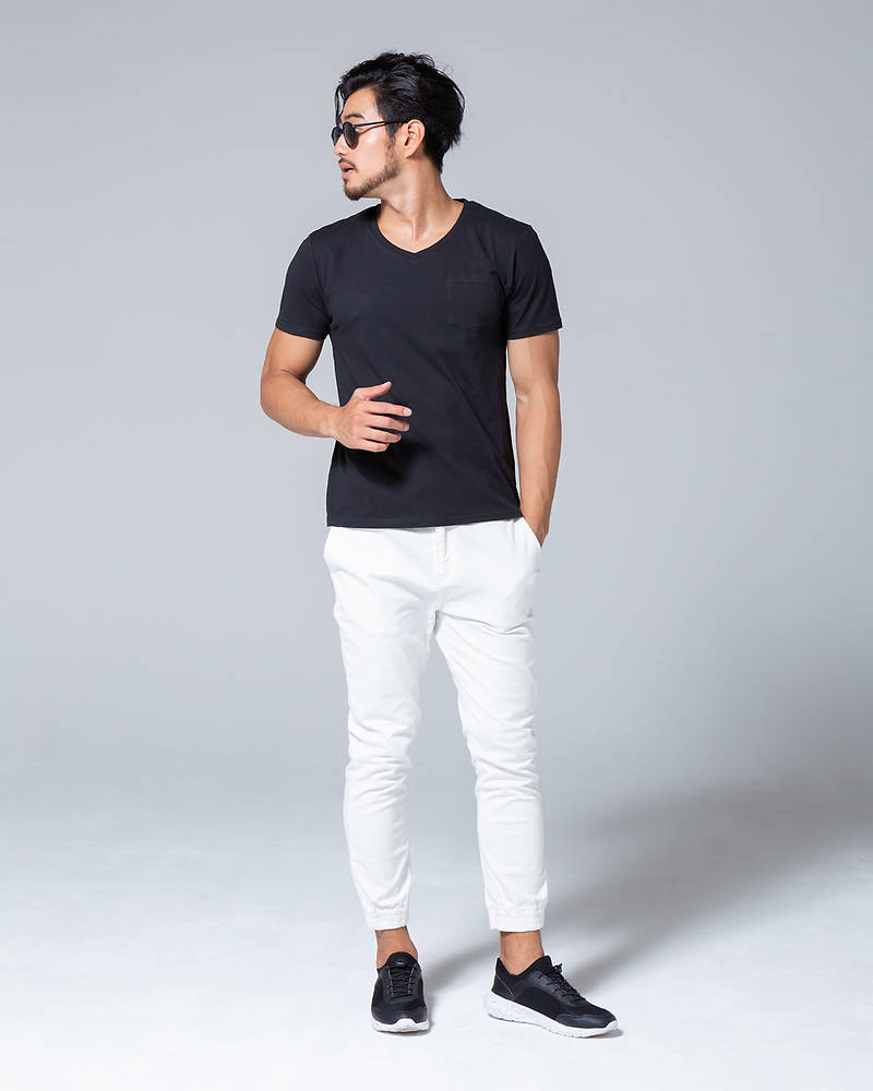 男らしい印象になる黒のTシャツに夏らしいホワイトパンツを合わせたモノトーンコーディネート!
