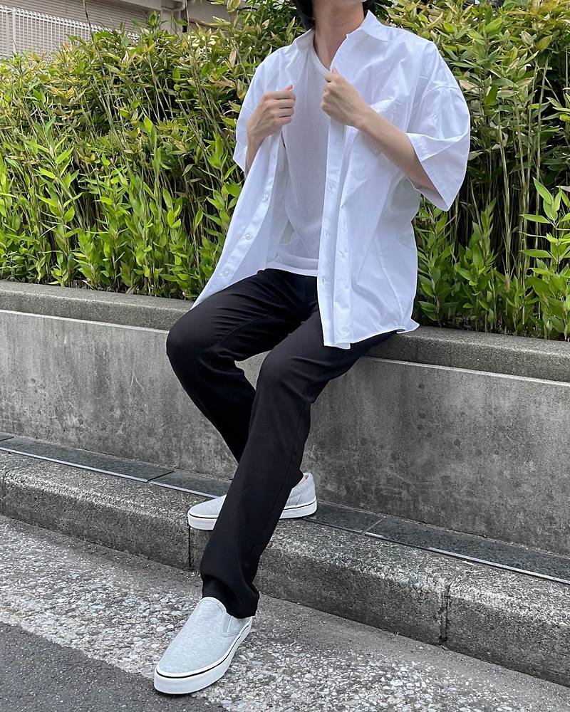 白シャツに白Tシャツでトップスは淡めで固めて、しっかりく暗めのパンツで締める夏の鉄板トータルコーディネート!