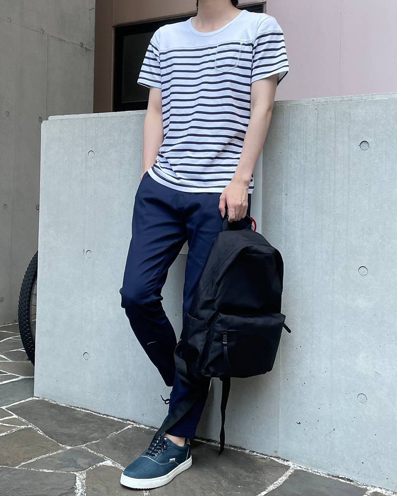 ボーダーxネイビーパンツで、夏にぴったりなマリン風コーディネート。