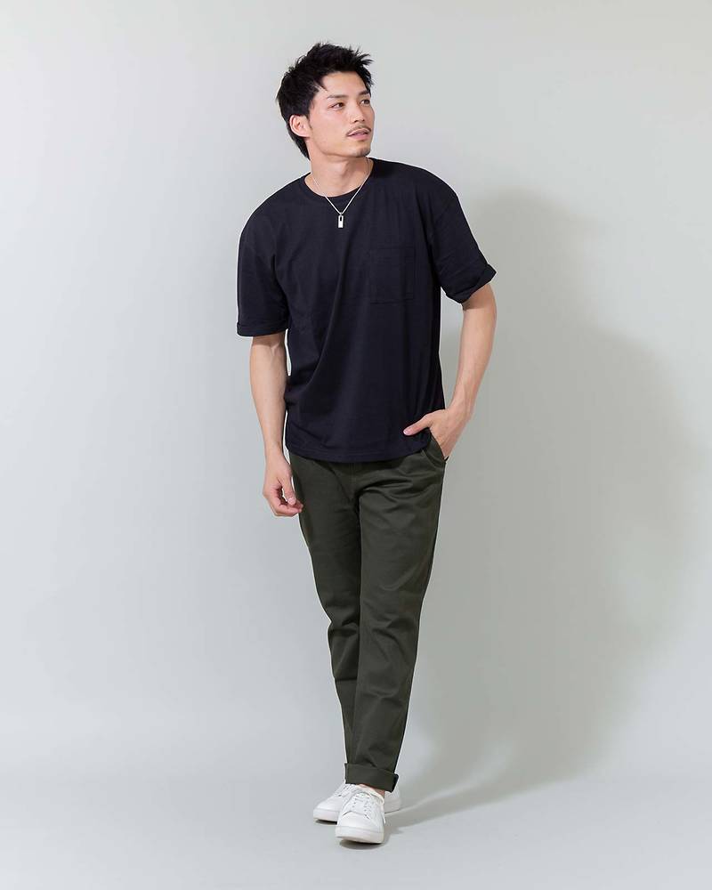 Tシャツにチノパンというシンプルなスタイルながら、色選びとシルエットでここまで印象が変わるという好例です。