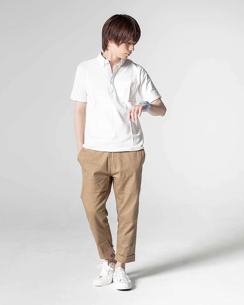 白いポロシャツとスニーカーに、クロップド丈のベージュチノパンコーデ。