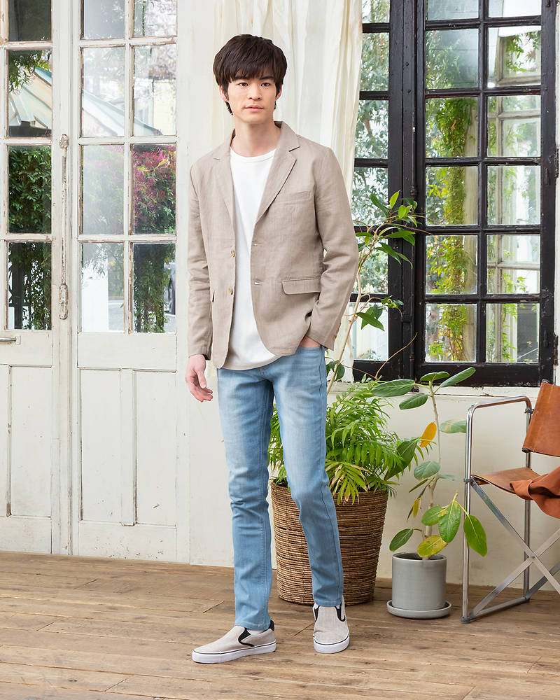 Tシャツ×デニムパンツの合わせに、麻ジャケットできちんと感をプラスした女の子ウケも期待できる『ノームコア』スタイル。