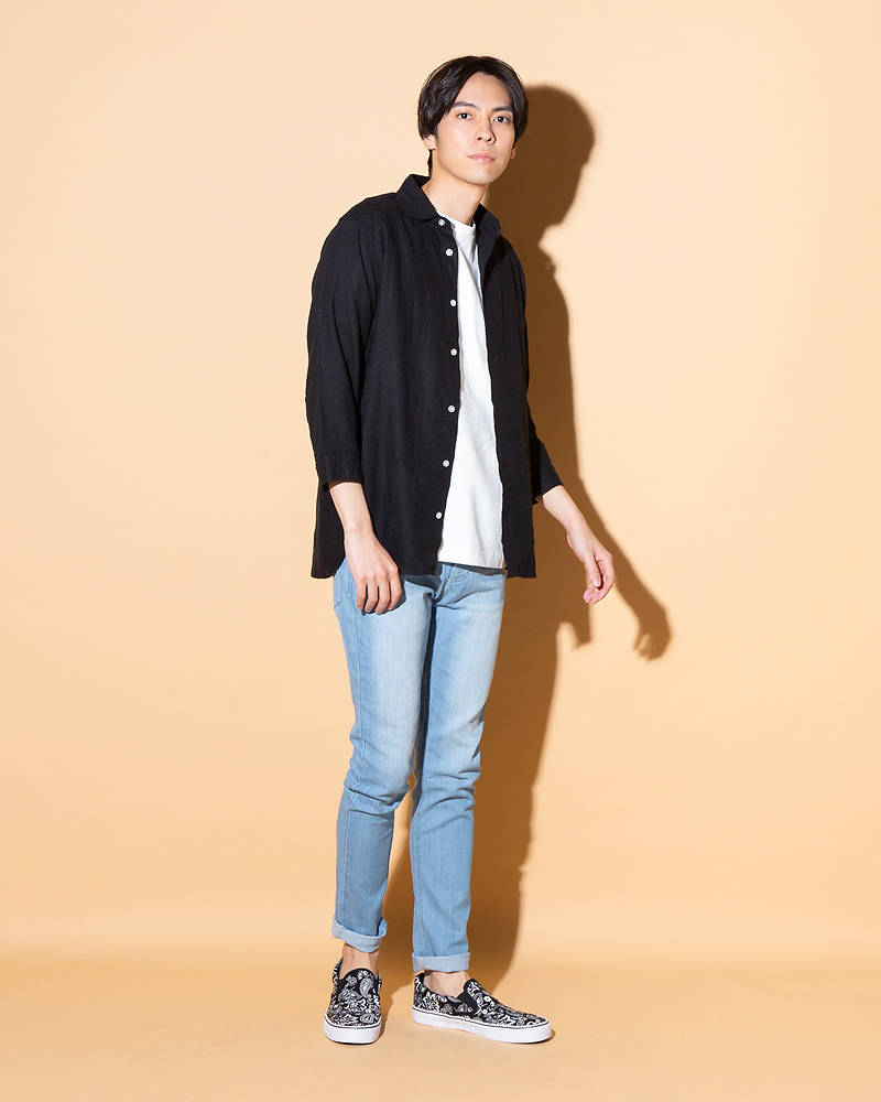 フレンチリネンレーヨンのシャツとデニムパンツに加え、インナーのホワイトTシャツも相まって爽やかな雰囲気。