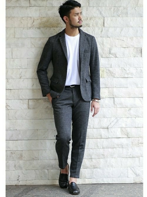 お堅いイメージのあるセットアップを、シンプルなホワイトTシャツでカジュアルダウンさせているのがお見事!