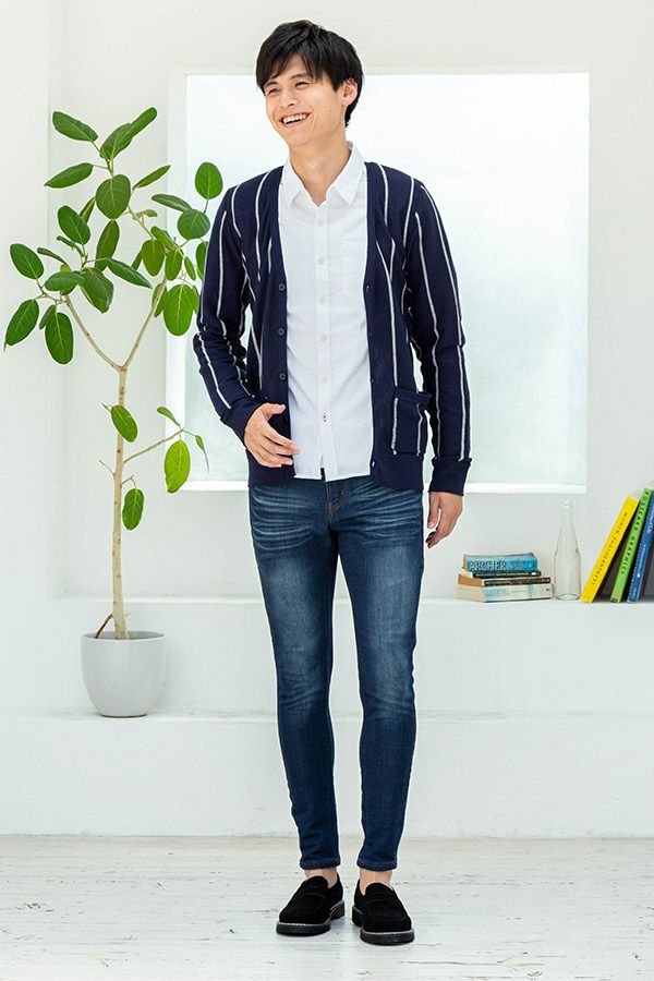 定番シャツコーデはストライプカーディガンを羽織って差をつける☆落ち着いた色だから誰でも着こなせます◎