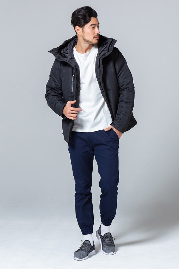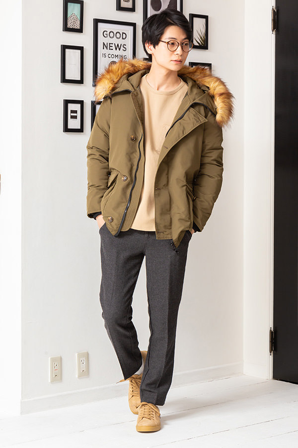 15:中綿ジャケット×長袖Tシャツ×カーキパンツ