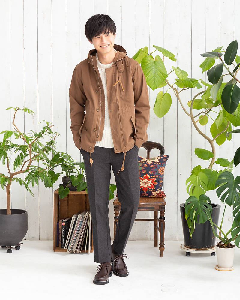 16:マウンテンパーカー×セーター×スラックス