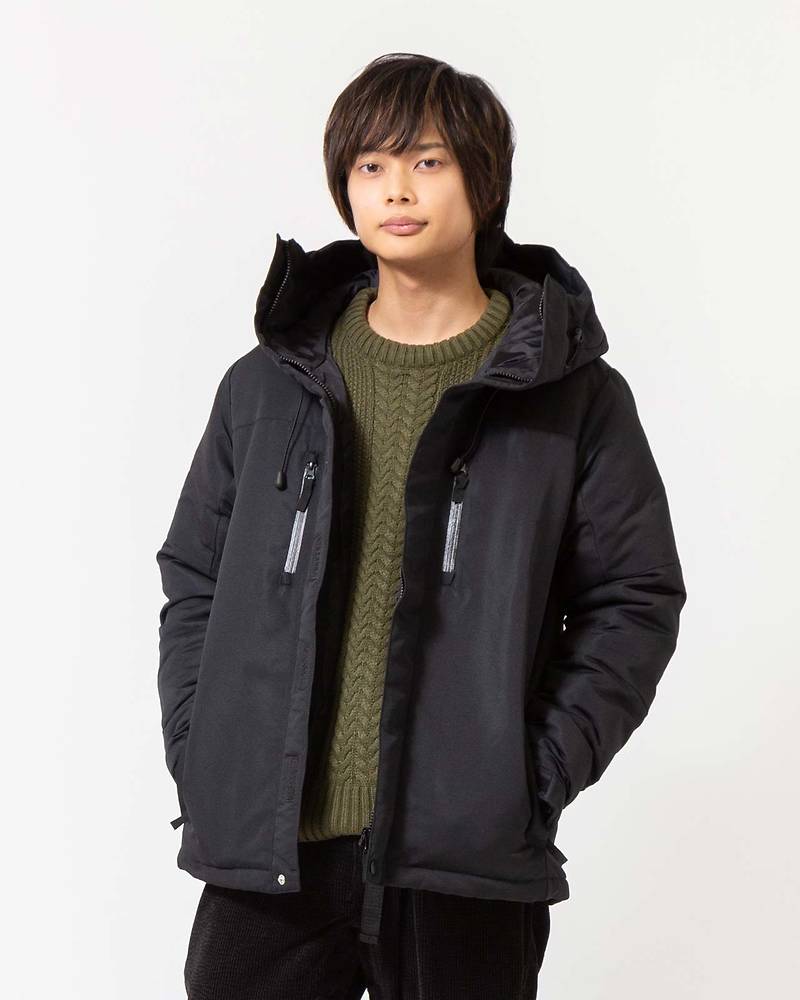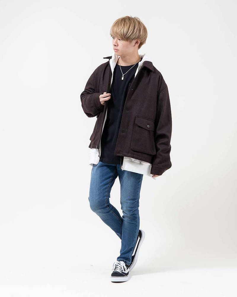 モコッとしているブルゾンにスタイリッシュに見えるジップセーターを加えたスマート重ね着コーデ