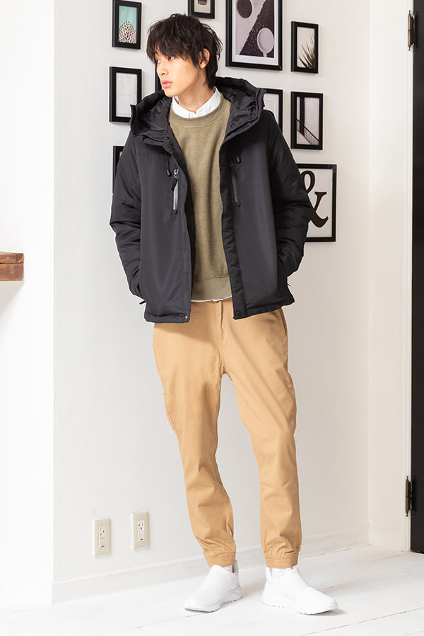 【15:ダウンジャケット×パーカー×カーキパンツ】