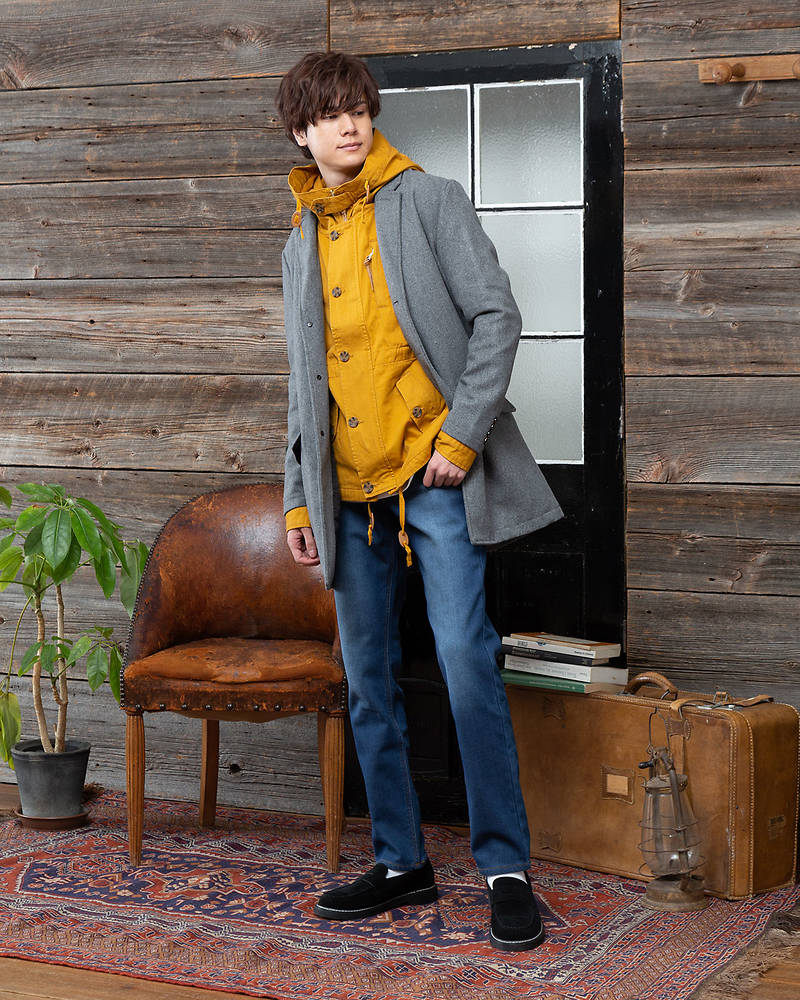 【11:チェスターコート×マウンテンパーカー×ジーンズ】