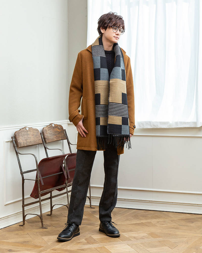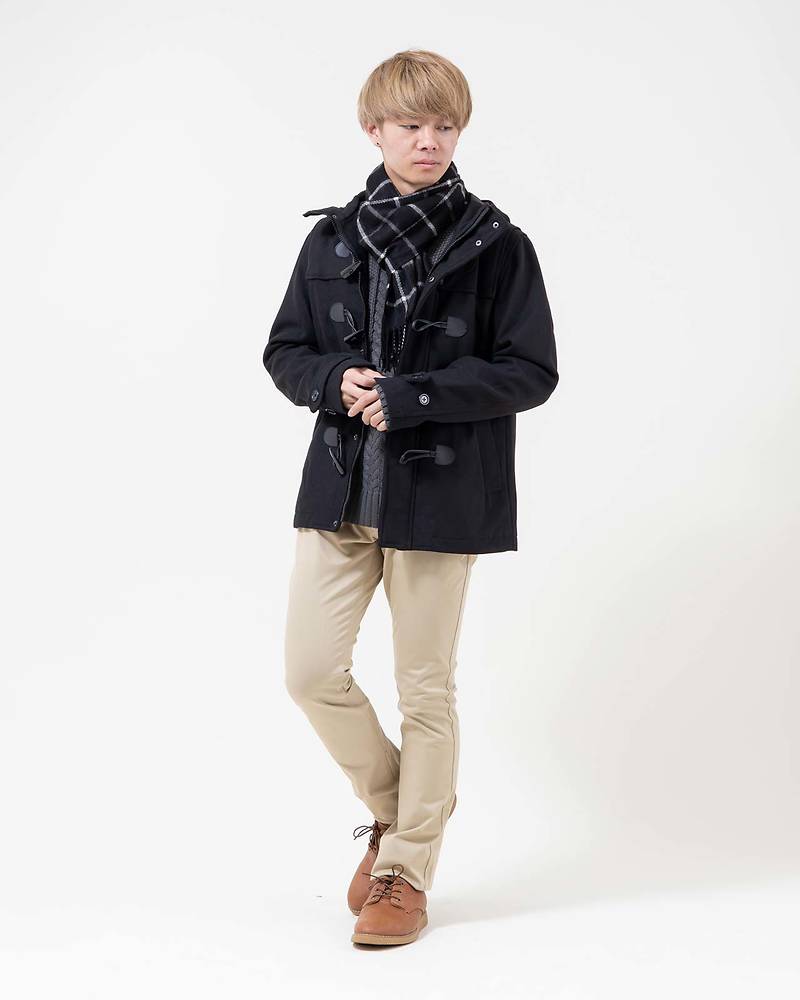 装飾のあるダッフルには色で主張をしすぎずに同色のマフラーに少し違う色を入れる程度が派手すぎずまとまりますね。