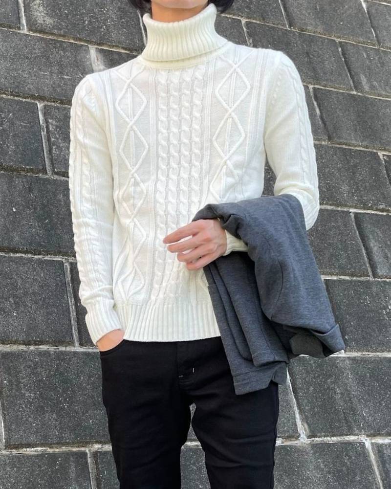 黒のアウターの中に白のタートルセーターが一際映えて、取り入れやすくもオシャレにも見せれます。