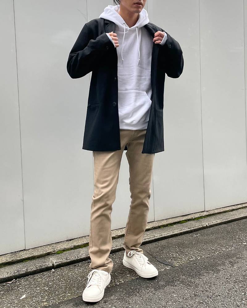 チェスターの大人っぽさとパーカーの若々しさがオシャレ感を引き立てますね!