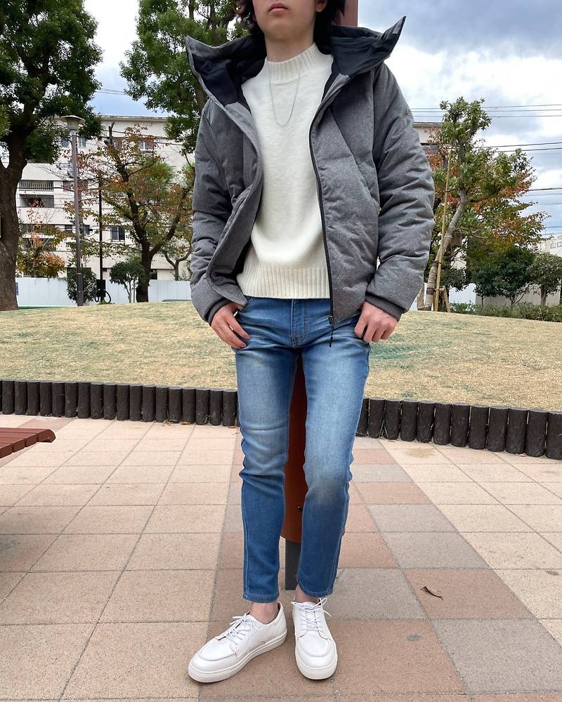 暖かさだけを求めるのではなく、しっかりオシャレを意識して映える白のスニーカーを合わせているのでうまいですね!