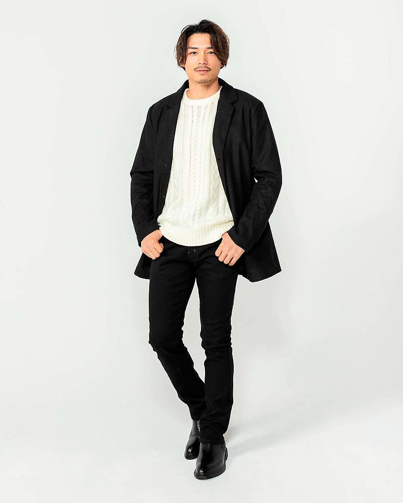 ケーブルニットとチェスターコート、チノパンというシンプルな組み合わせだけで仕上げた、上級者向けコーデ。