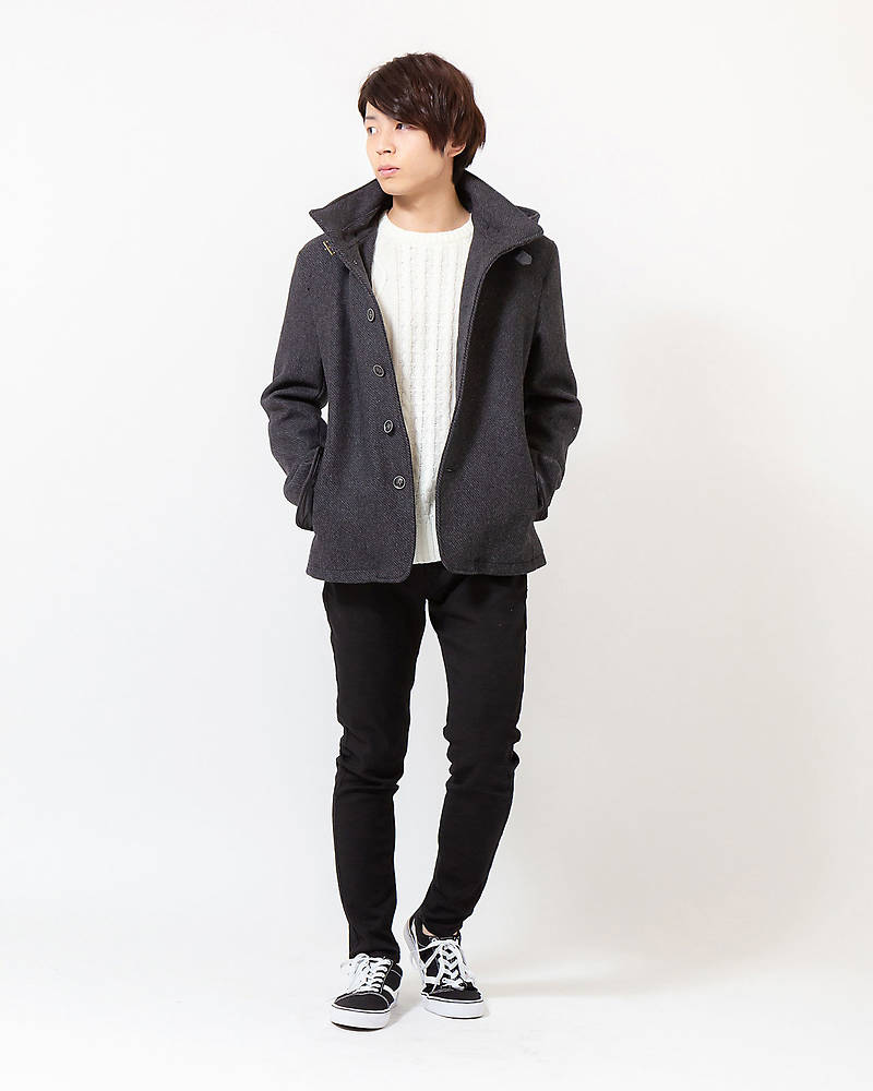 クールな印象の黒Pコートに、ベージュのケーブルニットを組み合わせた女子ウケ抜群な冬コーデ。
